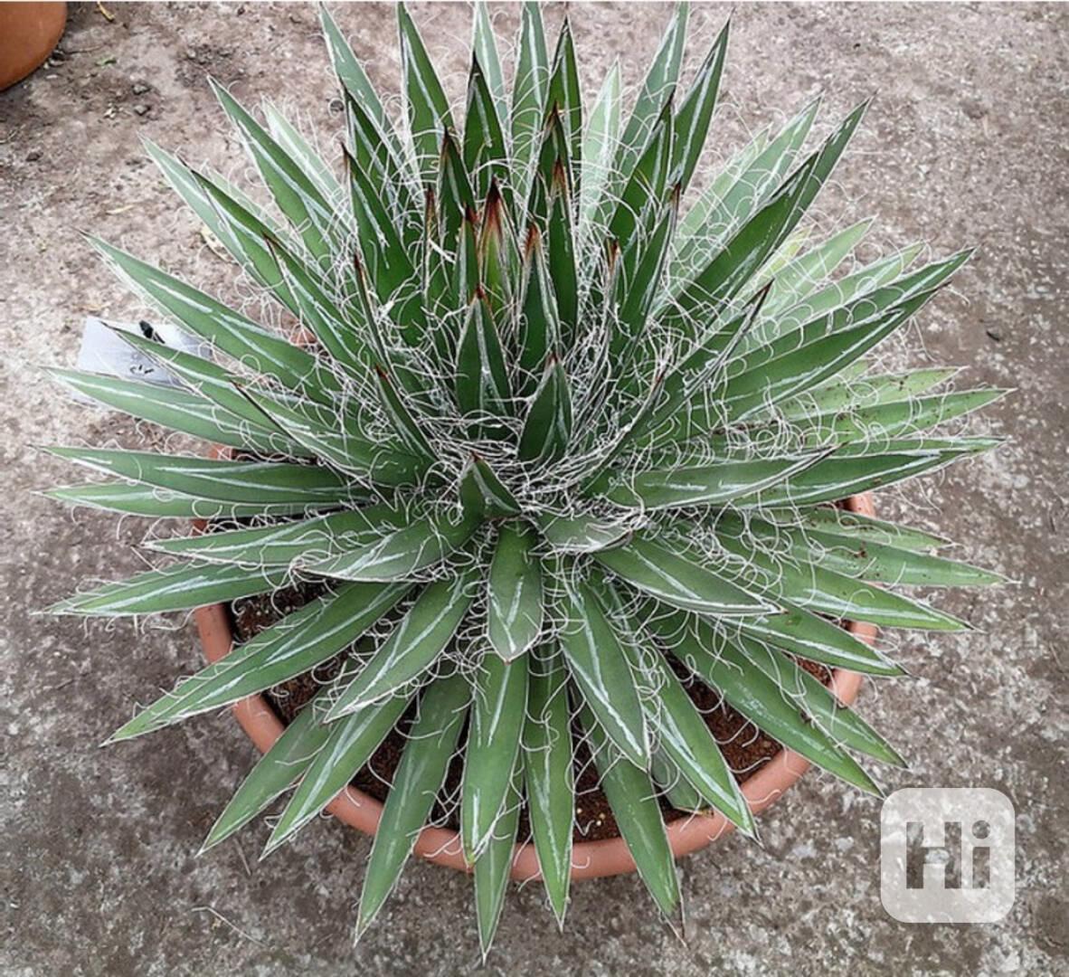 Agave schidigera nebo také Agave filifera subs. Schidigera je velmi krásný druh Agáve rostoucí v Mexických státech Chihuahua, Durango, Sinaloa a Sonora v nadmořské výšce 900 – 2500 m.Většinou solitérní, velmi symetrická rostlina (někdy má mírně zakřivené listy, které snižují symetrii) s průměrem 60 – 90 cm a výškou až 70 cm. Listy podobné dýkám mají délku 30 – 50 cm, šířku 2 – 4 cm. Jejich barva je vždyzelená, někdy načervenalá. Jsou zdobené bílými, jakoby namalovanými čárami po obou stranách a místo trnů na okrajích mají bílá vlákna, která se šíří do všech směrů a mohou být někdy dosti husté. Špička listu tvoří ostrý trn, dlouhý až 2 cm. Tato agáve začne kvést v závislosti na podmínkách. Může to trvat i 40 let nebo také podstatně méně, poté rostlina umírá. Květný stvol vyrůstající ze středu růžice může být až 3,5 m dlouhý, štíhle klasnatý s mnoha až 45 mm velkými, žlutými až zelenými nebo červenopurpurovými kvítky. Agave schidigera může být rozmnožována také pomocí výhonků, které často rostou kolem základny rostliny. Je to ideální a krásný druh do nádob, avšak nikoli v blízkosti chodníků, vzhledem k opravdu ostrým hrotům listů. Balení obsahuje 1 sazenici za 58 Kč. Semena – neoseeds