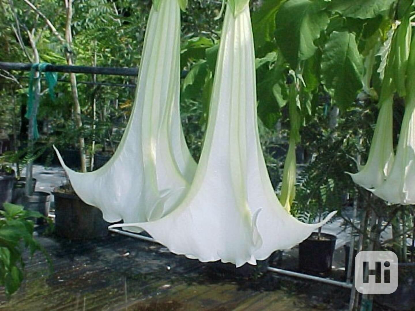 Brugmansia x Arborea neboli „Andělská trumpeta“ je impozantní okrasný keř, pocházející z jižní Ameriky, s překrásnými nápadnými květy, porostlý široce elipsovitými, střídavými, matně zelenými a sametově chlupatými listy, který se v našich klimatických podmínkách pěstuje jako přenosný. Kvete od června do října. Plodem jsou tobolky. Keř dorůstá výšky až 3 m. Brugmansia x Arborea kvete přibližně 30 cm dlouhými, bílými, omamně vonícími květy, připomínajícími trumpetu, proto též název „Andělská trumpeta“. Balení obsahuje 1 sazenici za 10 Kč. Semena & sazenice – neoseeds